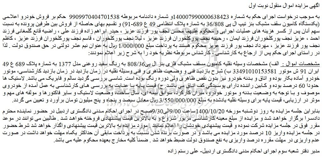 به موجب درخواست اجرای حکم به شماره 140007990000638423و شماره دادنامه مربوطه 9909970404701538 حکم بر فروش خودرو اعلامی (یکدستگاه کامیون سقف مشبک بنز تیپ ال پی 36/808 به شماره پلاک انتظامی 49 ع 689-91) و تقسیم بهای حاصله از فروش بین طرفین پرونده به نسبت سهم آنان پس از کسر هزینه های عملیات اجرایی و محکوم علیهما محسن نجف پور فرزند عزیز ، حیدر ابراهم زاده فرزند علی ، راضیه قانع گلمغانی فرزند احمد ، عزیز نجف پورکلخوران فرزند ایمان ، رحیمه نجف پورکلخوران فرزند عزیز ، لیلا نجف پورکلخوران ، قاسم نجف پورکلخوران فرزند عزیز ، کاظم نجف پور فرزند عزیز ، مهرداد نجف پور فرزند عزیز محکوم هستند به پرداخت مبلغ 1/000/000 ریال به عنوان نیم عشر دولتی در حق صندوق دولت . لذا در راستای اجرای حکم پس از ارجاع به کارشناسی ، کارشناس مربوطه نظریه خود را به شرح زیر اعلام نمودند:
