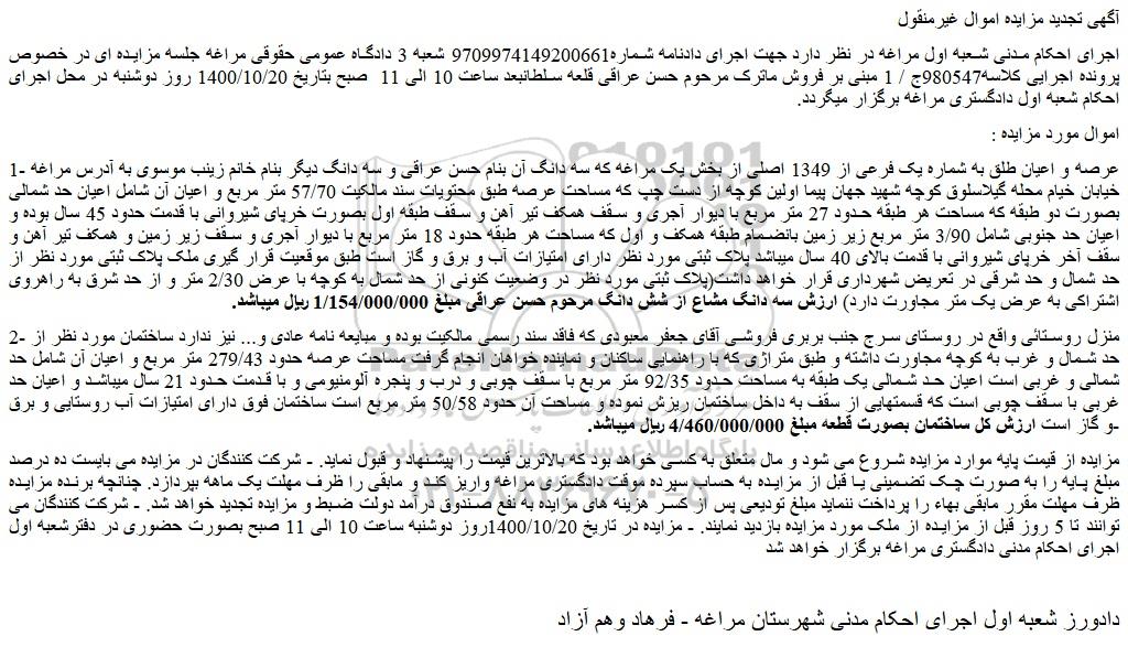 اجرای احکام مدنی شعبه اول مراغه در نظر دارد جهت اجرای دادنامه شماره9709974149200661 شعبه 3 دادگاه عمومی حقوقی مراغه جلسه مزایده ای در خصوص پرونده اجرایی کلاسه980547ج / 1 مبنی بر فروش ماترک مرحوم حسن عراقی قلعه سلطانبعد ساعت 10 الی 11 صبح بتاریخ 1400/10/20 روز دوشنبه در محل اجرای احکام شعبه اول دادگستری مراغه برگزار میگردد.