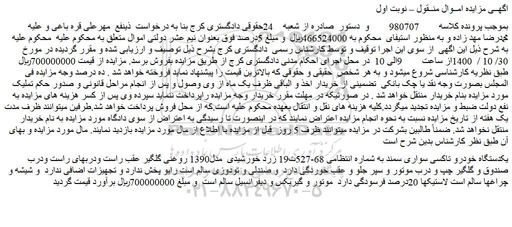 بموجب پرونده کلاسه 980707 و دستور صادره از شعبه 24حقوقی دادگستری کرج بنا به درخواست ذینفع مهرعلی قره باغی و علیه محمدرضا مهد زاده و به منظور استیفای محکوم به 466524000ریال و مبلغ 5درصد فوق بعنوان نیم عشر دولتی اموال متعلق به محکوم علیه محکوم علیه به شرح ذیل این اگهی از سوی این اجرا توقیف و توسط کارشناس رسمی دادگستری کرج بشرح ذیل توصیف و ارزیابی شده و مقرر گردیده در مورخ 30/ 10 / 1400از ساعت 9الی 10 در محل اجرای احکام مدنی دادگستری کرج از طریق مزایده بفروش برسد. مزایده از قیمت 700000000ریال طبق نظریه کارشناسی شروع میشود و به هر شخص حقیقی و حقوقی که بالاترین قیمت را پیشنهاد نماید فروخته خواهد شد . ده درصد وجه مزایده فی المجلس بصورت وجه نقد یا چک بانکی تضمینی از خریدار اخذ و الباقی ظرف یک ماه از وی وصول و پس از انجام مراحل قانونی و صدور حکم تملیک مورد مزایده بنام خریدار منتقل خواهد شد . در صورتیکه در مهلت مقرر خریدار وجه مزایده راپرداخت ننماید سپرده وی پس از کسر هزینه های مزایده به نفع دولت ضبط و مزایده تجدید میگردد.کلیه هزینه های نقل و انتقال بعهده محکوم علیه است.که از محل فروش پرداخت خواهد شد.طرفین میتوانند ظرف مدت یک هفته از تاریخ مزایده نسبت به نحوه انجام مزایده اعتراض نمایند که در اینصورت تا رسیدگی به اعتراض از سوی دادگاه مورد مزایده به نام خریدار منتقل نخواهد شد. ضمناً طالبین بشرکت در مزایده میتوانند ظرف 5 روز قبل از مزایده با اطلاع از مال مورد مزایده بازدید نمایند. مال مورد مزایده و بهای آن طبق نظر کارشناس بدین شرح است