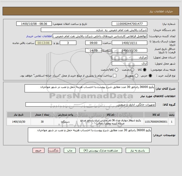 شرح کلی نیاز: پکیج 36000 رادیاتور 30 عدد مطابق شرح پیوست.با احتساب هزینه حمل و نصب در شهر مهاجران