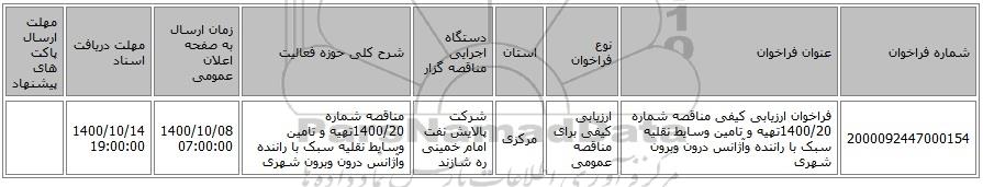 مناقصه، فراخوان ارزیابی کیفی مناقصه شماره 1400/20تهیه و تامین وسایط نقلیه سبک با راننده وآژانس درون وبرون شهری, فراخوان ارزیابی کیفی مناقصه شماره 1400/20تهیه و تامین وسایط نقلیه سبک با راننده وآژانس درون وبرون شهری