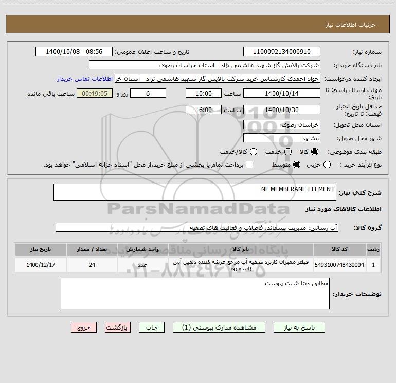 نام دستگاه خریدار:شرکت پالایش گاز شهید هاشمی نژاد استان خراسان رضوی