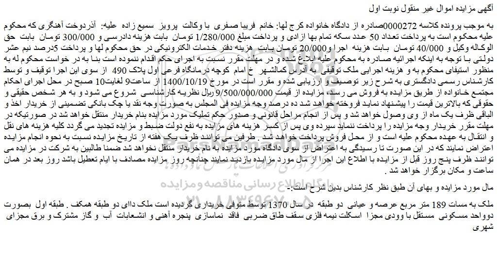 به موجب پرونده کلاسه 0000272صادره از دادگاه خانواده کرج لها: خانم  فریبا صفری  با وکالت  پرویز  سمیع زاده  علیه:  آذردوخت آهنگری که محکوم علیه محکوم است به پرداخت تعداد 50 عدد سکه تمام بها ازادی و پرداخت مبلغ 1/280/000 تومان  بابت هزینه دادرسی و 300/000 تومان  بابت  حق الوکاله وکیل و 40/000 تومان  بابت هزینه  اجرا و20/000 تومان بابت  هزینه دفتر خدمات الکترونیکی در حق محکوم لها و پرداخت 5درصد نیم عشر دولتی با توجه به اینکه اجرائیه صادره به محکوم علیه ابلاغ شده و در مهلت مقرر نسبت به اجرای حکم اقدام ننموده است بنا به در خواست محکوم له به منظور استیفای محکوم به و هزینه اجرایی ملک توقیفی  به آدرس کمالشهر  خ امام  کوچه درمانگاه فرعی اول پلاک 490  از سوی این اجرا توقیف و توسط کارشناس رسمی دادگستری به شرح زیر توصیف و ارزیابی شده و مقرر است در مورخ 1400/10/19 از ساعت9 لغایت10 صبح در محل اجرای احکام مجتمع خانواده از طریق مزایده به فروش می رسد، مزایده از قیمت 9/500/000/000 ریال نظریه کارشناسی  شروع می شود و به هر شخص حقیقی و حقوقی که بالاترین قیمت را پیشنهاد نماید فروخته خواهد شد ده درصد وجه مزایده فی المجلس به صورت وجه نقد یا چک بانکی تضمینی از خریدار اخذ و الباقی ظرف یک ماه از وی وصول خواهد شد و پس از انجام مراحل قانونی و صدور حکم تملیک مورد مزایده بنام خریدار منتقل خواهد شد در صورتیکه در مهلت مقرر خریدار وجه مزایده را پرداخت ننماید سپرده وی پس از کسر هزینه های مزایده به نفع دولت ضبط و مزایده تجدید می گردد کلیه هزینه های نقل و انتقال به عهده محکوم علیه است و از محل فروش پرداخت خواهد شد . طرفین می توانند ظرف یک هفته از تاریخ مزایده نسبت به نحوه انجام مزایده اعتراض نمایند که در این صورت تا رسیدگی به اعتراض از سوی دادگاه مورد مزایده به نام خریدار منتقل نخواهد شد ضمنا طالبین به شرکت در مزایده می توانند ظرف پنج روز قبل از مزایده با اطلاع این اجرا از مال مورد مزایده بازدید نمایند چنانچه روز مزایده مصادف با ایام تعطیل باشد روز بعد در همان ساعت و مکان برگزار خواهد شد .