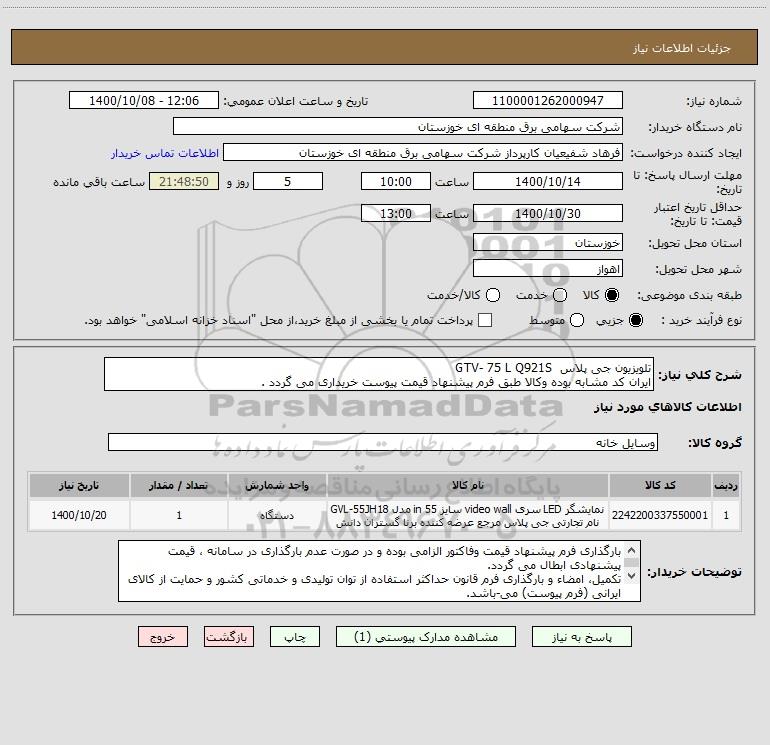 استعلام تلویزیون جی پلاس GTV- 75 L Q921S ایران کد مشابه بوده وکالا طبق فرم پیشنهاد قیمت پیوست خریداری می گردد ., استعلام تلویزیون جی پلاس GTV- 75 L Q921S ایران کد مشابه بوده وکالا طبق فرم پیشنهاد قیمت پیوست خریداری می گردد .