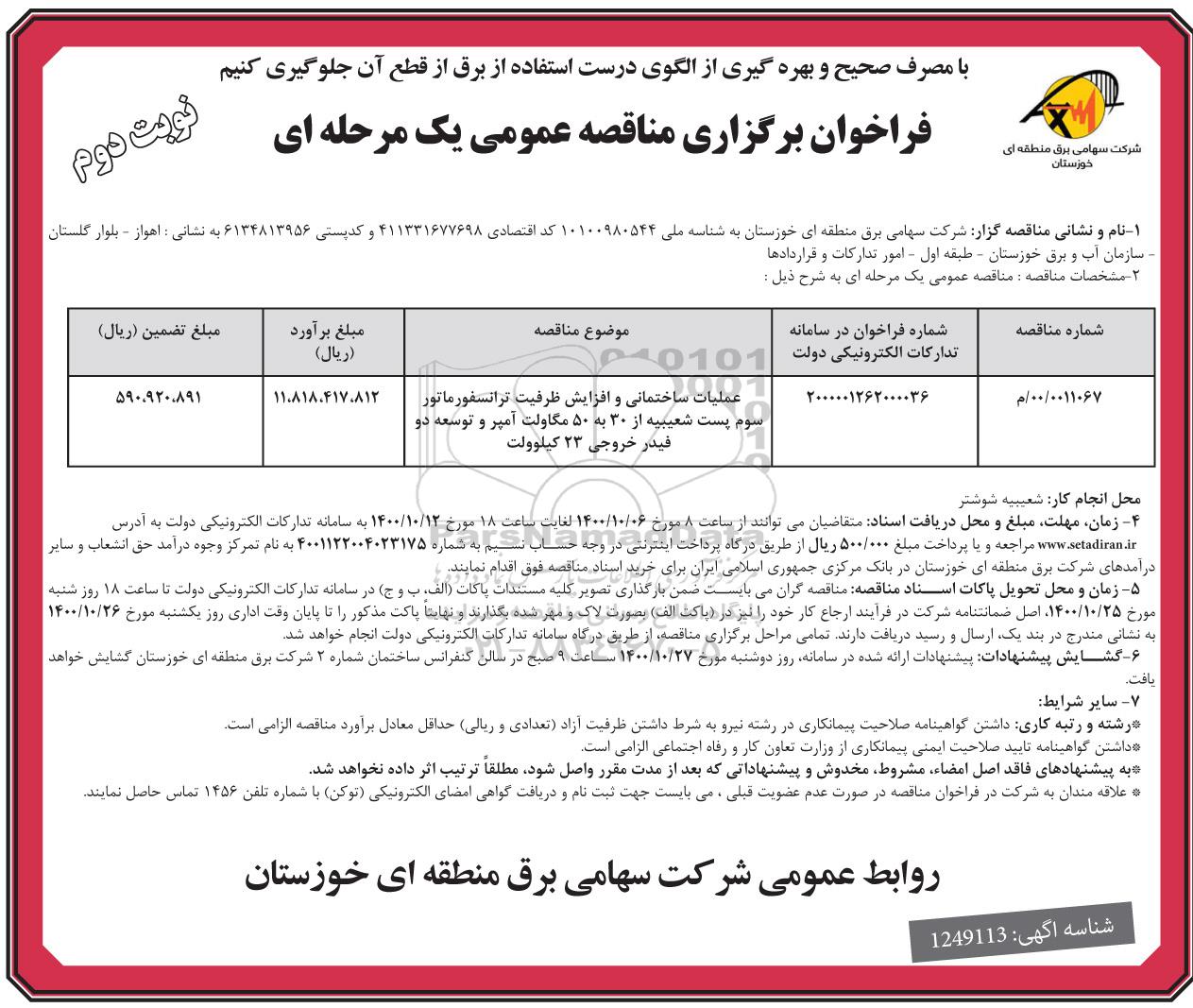 | 0011067/ 00/ م | 2000001262000036 | علمیات ساختمانی و افزایش ظرفیت ترانسفورماتور سوم پست شعیبیه از 30 به 50 مگاولت آمپر و توسعه دو فیدر خروجی 23 کیلوولت | 11.818.417.812 | 590.920.891 |