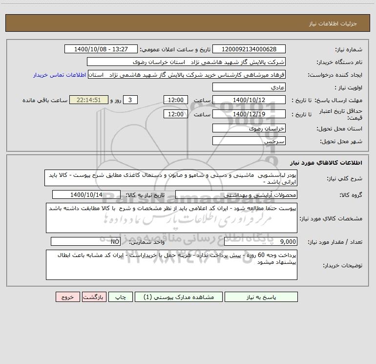 نام دستگاه خریدار:شرکت پالایش گاز شهید هاشمی نژاد استان خراسان رضوی