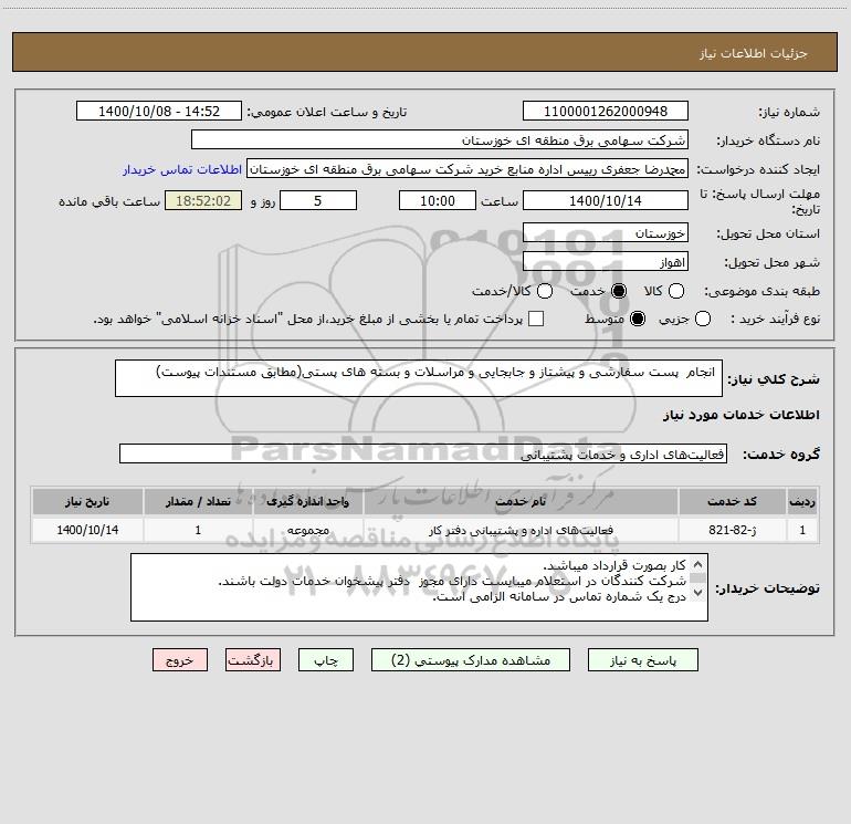شرح کلی نیاز: انجام پست سفارشی و پیشتاز و جابجایی و مراسلات و بسته های پستی(مطابق مستندات پیوست)