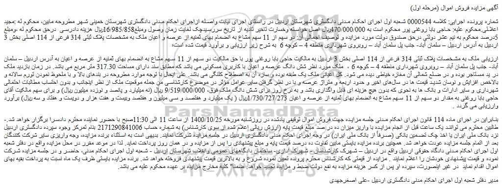 شماره پرونده اجرایی: کلاسه 0000544 شعبه اول اجرای احکام مدنی دادگستری شهرستان اردبیل در راستای اجرای نیابت واصله ازاجرای احکام مدنی دادگستری شهرستان خمینی شهر مطروحه مابین، محکوم له :مجید اعلائی.محکوم علیه: حاجی بابا روغنی پور محکوم است به 470/000/000ریال اصل خواسته وخسارت تاخیر تادیه از تاریخ سررسیدچک لغایت زمان وصول ومبلغ16/985/858ریال هزینه دادرسی درحق محکوم له ،ومبلغ 5درصد محکوم به نیم عشر دولتی درحق صندوق دولت مورد مزایده و توصیف اجمالی آن: دو سهم از 11 سهم مشاع به انضمام بهای ثمنیه از عرصه و اعیان ملک به مشخصات پلاک ثبتی 314 فرعی از 114 اصلی بخش 3 اردبیل به آدرس اردبیل – سلمان آباد- جنب پل سلمان آباد – روبروی شهرداری منطقه 4 – کوچه 6 به شرح زیر ارزیابی و برآورد قیمت شده است؛