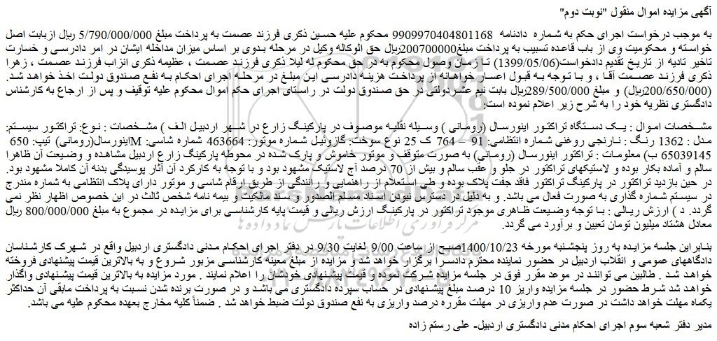 بنابراین جلسه مزایده به روز پنجشنبه مورخه 1400/10/23صبح از ساعت 9/00 لغایت 9/30 در دفتر اجرای احکام مدنی دادگستری اردبیل واقع در شهرک کارشناسان دادگاههای عمومی و انقلاب اردبیل در حضور نماینده محترم دادسرا برگزار خواهد شد و مزایده از مبلغ معینه کارشناسی مزبور شروع و به بالاترین قیمت پیشنهادی فروخته خواهد شد . طالبین می توانند در موعد مقرر فوق در جلسه مزایده شرکت نموده و قیمت پیشنهادی خودشان را اعلام نمایند . مورد مزایده به بالاترین قیمت پیشنهادی واگذار خواهد شد شرط حضور در جلسه مزایده واریز 10 درصد مبلغ پیشنهادی در حساب سپرده دادگستری می باشد و در صورت برنده شدن نسبت به پرداخت مابقی آن حداکثر یکماه مهلت خواهد داشت در صورت عدم واریزی در مهلت مقرره درصد واریزی به نفع صندوق دولت ضبط خواهد شد . ضمناً کلیه مخارج بعهده محکوم علیه می باشد.