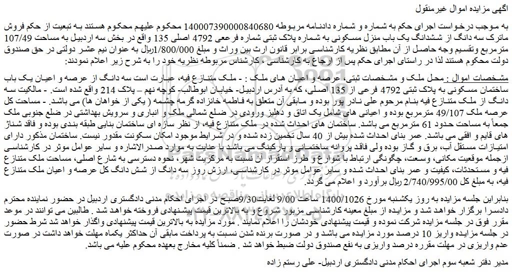 به موجب درخواست اجرای حکم به شماره و شماره دادنامه مربوطه 140007390000840680 محکوم علیهم محکوم هستند به تبعیت از حکم فروش ماترک سه دانگ از ششدانگ یک باب منزل مسکونی به شماره پلاک ثبتی شماره فرععی 4792 اصلی 135 واقع در بخش سه اردبیل به مساحت 107/49 مترمربع وتقسیم وجه حاصل از آن مطابق نظریه کارشناسی برابر قانون ارث بین وراث و مبلغ 1/800/000ریال به عنوان نیم عشر دولتی در حق صندوق دولت محکوم هستند لذا در راستای اجرای حکم پس از ارجاع به کارشناسی ، کارشناس مربوطه نظریه خود را به شرح زیر اعلام نمودند:
