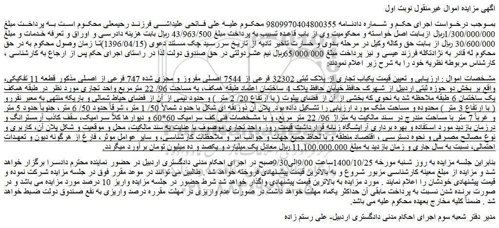 شعبه صادر کننده:شعبه سوم اجرای احکام مدنی دادگستری شهرستان اردبیل