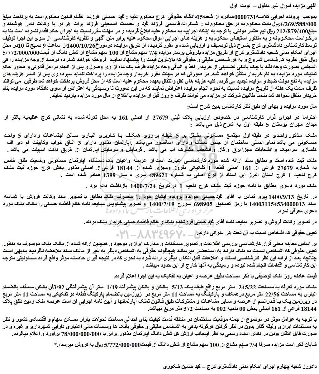 بموجب پرونده اجرایی کلاسه0000731صادره از شعبه15دادگاه حقوقی کرج محکوم علیه : محمد حسنی فرزند نظام الدین محکوم است به پرداخت مبلغ 4/269/588/000ریال بابت محکوم به در حق محکوم له : شکراله قاسمی فرزند محمد و عصمت اسمعیلی فرزند برات هر دو با وکالت نادر هوشمند و مبلغ212/879/400 ریال نیم عشر دولتی. با توجه به اینکه اجراییه به محکوم علیه ابلاغ گردیده و در مهلت مقررنسبت به اجرای حکم اقدام ننموده است بنا به درخواست محکوم له و به منظور استیفای محکوم به و هزینه های اجرایی اموال محکوم علیه برابر متن آگهی و نظریه کارشناسی از سوی این اجرا توقیف توسط کارشناس دادگستری کرج بشرح ذیل توصیف و ارزیابی شده و مقرر گردیده از طریق مزایده درمورخ1400/10/26از ساعت 9 صبح تا 10در محل اجرای احکام مدنی شعبه دادگستری کرج از طریق مزایده بفروش برسد. مزایده 7/4 سهم مشاع از 100 سهم مشاع از شش دانگ از قیمت5/772/000/000 ریال طبق نظریه کارشناس شروع و به هر شخص حقیقی و حقوقی که بالاترین قیمت را پیشنهاد نمایید فروخته خواهد شد. ده درصد از وجه مزایده را فی المجلس بصورت وجه نقد یا چک بانکی تضمینی از خریدار اخذ و الباقی وجه مزایده ظرف یک ماه از وی وصول و پس از انجام مراحل قانونی و صدور حکم تملیک مورد مزایده به نام خریدار منتقل خواهد شد. در صورتی که در مهلت مقرر خریدار وجه مزایده را پرداخت ننماید سپرده وی پس از کسر هزینه های مزایده به نفع دولت ضبط و مزایده تجدید می گردد. کلیه هزینه های نقل وانتقال بعهده محکوم علیه است که از محل فروش پرداخت خواهد شد طرفین می توانند ظرف مدت یک هفته از تاریخ مزایده نسبت به نحوه انجام مزایده اعتراض نمایند که در این صورت تا رسیدگی به اعتراض از سوی دادگاه مورد مزایده بنام خریدار منتقل نخواهد شد ضمنا طالبین شرکت در مزایده می توانند ظرف 5 روز قبل از مزایده بااطلاع از مال مورد مزایده بازدید نمایند.