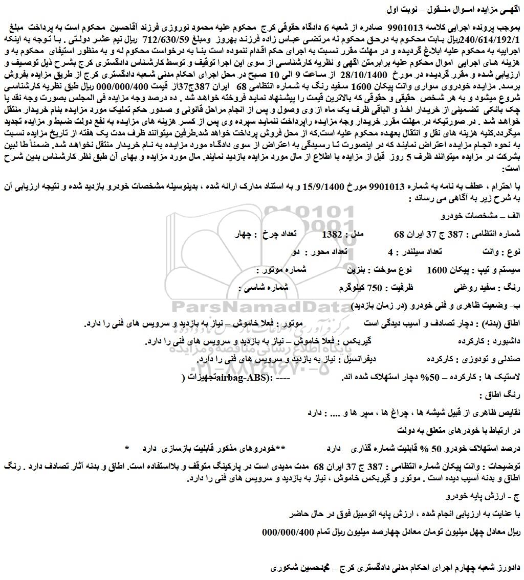 بموجب پرونده اجرایی کلاسه 9901013 صادره از شعبه 6 دادگاه حقوقی کرج محکوم علیه محمود نوروزی فرزند آقاحسین محکوم است به پرداخت مبلغ 240/614/192/1ریال بابت محکوم به درحق محکوم له مرتضی عباس زاده فرزند بهروز ومبلغ 712/630/59 ریال نیم عشر دولتی . با توجه به اینکه اجراییه به محکوم علیه ابلاغ گردیده و در مهلت مقرر نسبت به اجرای حکم اقدام ننموده است بنا به درخواست محکوم له و به منظور استیفای محکوم به و هزینه های اجرایی اموال محکوم علیه برابرمتن اگهی و نظریه کارشناسی از سوی این اجرا توقیف و توسط کارشناس دادگستری کرج بشرح ذیل توصیف و ارزیابی شده و مقرر گردیده در مورخ 28/10/1400 از ساعت 9 الی 10 صبح در محل اجرای احکام مدنی شعبه دادگستری کرج از طریق مزایده بفروش برسد. مزایده خودروی سواری وانت پیکان 1600 سفید رنگ به شماره انتظامی 68 ایران 387ج37از قیمت 000/000/400 ریال طبق نظریه کارشناسی شروع میشود و به هر شخص حقیقی و حقوقی که بالاترین قیمت را پیشنهاد نماید فروخته خواهد شد . ده درصد وجه مزایده فی المجلس بصورت وجه نقد یا چک بانکی تضمینی از خریدار اخذ و الباقی ظرف یک ماه از وی وصول و پس از انجام مراحل قانونی و صدور حکم تملیک مورد مزایده بنام خریدار منتقل خواهد شد . در صورتیکه در مهلت مقرر خریدار وجه مزایده راپرداخت ننماید سپرده وی پس از کسر هزینه های مزایده به نفع دولت ضبط و مزایده تجدید میگردد.کلیه هزینه های نقل و انتقال بعهده محکوم علیه است.که از محل فروش پرداخت خواهد شد.طرفین میتوانند ظرف مدت یک هفته از تاریخ مزایده نسبت به نحوه انجام مزایده اعتراض نمایند که در اینصورت تا رسیدگی به اعتراض از سوی دادگاه مورد مزایده به نام خریدار منتقل نخواهد شد. ضمناً طا لبین بشرکت در مزایده میتوانند ظرف 5 روز قبل از مزایده با اطلاع از مال مورد مزایده بازدید نمایند. مال مورد مزایده و بهای آن طبق نظر کارشناس بدین شرح است: