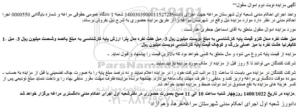 "آگهی مزایده نوبت دوم اموال منقول"