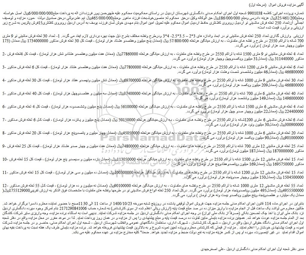 شماره پرونده اجرایی: کلاسه 9901038 شعبه اول اجرای احکام مدنی دادگستری شهرستان اردبیل در راستای محکومیت محکوم علیه ظهیرحسن پور فرزنداذن اله به پرداخت مبلغ6/000/000/000ریال اصل خواسته ومبلغ325/461/200ریال هزینه دادرسی ومبلغ 186/000/000ریال حق الوکاله وکیل درحق محکوم له: منصورخوشبخت فرزند ماهور ،ومبلغ465/000/000ریال نیم عشردولتی درحق صندوق دولت ،مورد مزایده و توصیف اجمالی آن:تعداد 250 تخته فرش ماشینی نو اردبیل روبروی کلانتری حافظ اردبیل اموال محکوم علیه تحویل امین اموال بنام مهدی خوش لسان فرزند یوسف به آدرس اردبیل روبروی کلانتری15فرش پاتریس به شرح زیر ارزیابی و برآورد قیمت شده است؛