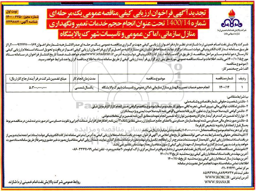 | 1 | 1400/14 | انجام حجم خدمات تعمیر و نگهداری منازل سازمانی، اماکن عمومی و تاسیسات شهرک پالایشگاه | یکسال شمسی | 5.300.000.000 |