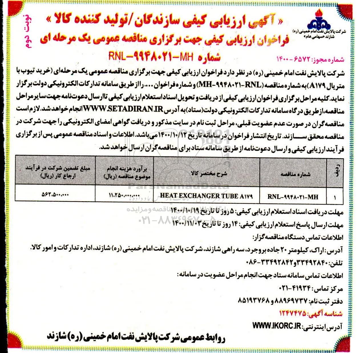 شرکت پالایش نفت امام خمینی (ره) در نظر دارد فراخوان ارزیابی کیفی جهت برگزاری مناقصه عمومی یک مرحله ای (خرید تیوب با متریال A179) به شماره مناقصه MH-9948021-RNL و شماره فراخوان ... را از طریق سامانه تدارکات الکترونیکی دولت برگزار نماید کلیه مراحل برگزاری فراخوان ارزیابی کیفی از دریافت و تحویل اسناد استعلام ارزیابی کیفی تا ارسال دعوت نامه جهت سایر مراحل مناقصه از طریق درگاه سامانه تدارکات الکترونیکی دولت ستاد به آدرس ستاد ایران انجام خواهد شد لازم است مناقصه گران در صورت عدم عضویت قبلی مراحل ثبت نام در سایت مذکور و دریافت گواهی امضای الکترونیکی ار جهت شرکت در مناقصه محقق سازند. تاریخ انتشار فراخوان در سامانه تاریخ 1400.10.12 می باشد. اطلاعات و اسناد مناقصه عمومی پس از برگزاری فرآیند ارزیابی کیفی و ارسال دعوتنامه از طریق سامانه ستاد برای مناقصه گران ارسال خواهد شد.