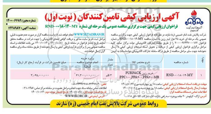 شرکت پالایش نفت امام خمینی (ره) در نظر دارد فراخوان ارزیابی کیفی جهت برگزاری مناقصه عمومی یک مرحله ای خرید 35 هزار لیتر رزین به شماره RND-0018021-MD و شماره فراخوان 2000092447000162 را از طریق سامانه تدارکات الکترونیکی دولت برگزار کند. کلیه مراحل برگزاری فراخوان ارزیابی کیفی از دریافت و تحویل اسناد استعلام ارزیابی کیفی تا ارسال دعوت نامه جهت سایر مراحل مناقصه از طریق درگاه سامانه تدارکات الکترونیکی دولت ستاد به آدرس ستاد ایران انجام خواهد شد لازم است مناقصه گران در صورت عدم عضویت قبلی مراحل ثبت نام در سایت مذکور و دریافت گواهی امضای الکترونیکی ار جهت شرکت در مناقصه محقق سازند. تاریخ انتشار فراخوان در سامانه تاریخ 1400.10.11 و 1400.10.14 می باشد. اطلاعات و اسناد مناقصه عمومی پس از برگزاری فرآیند ارزیابی کیفی و ارسال دعوتنامه از طریق سامانه ستاد برای مناقصه گران ارسال خواهد شد.