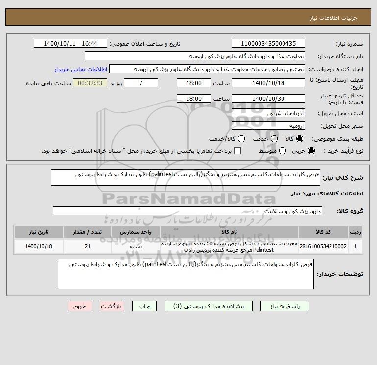 شرح کلی نیاز: قرص کلراید،سولفات،کلسیم،مس،منیزیم و منگنز(پالین تستpalintest) طبق مدارک و شرایط پیوستی
