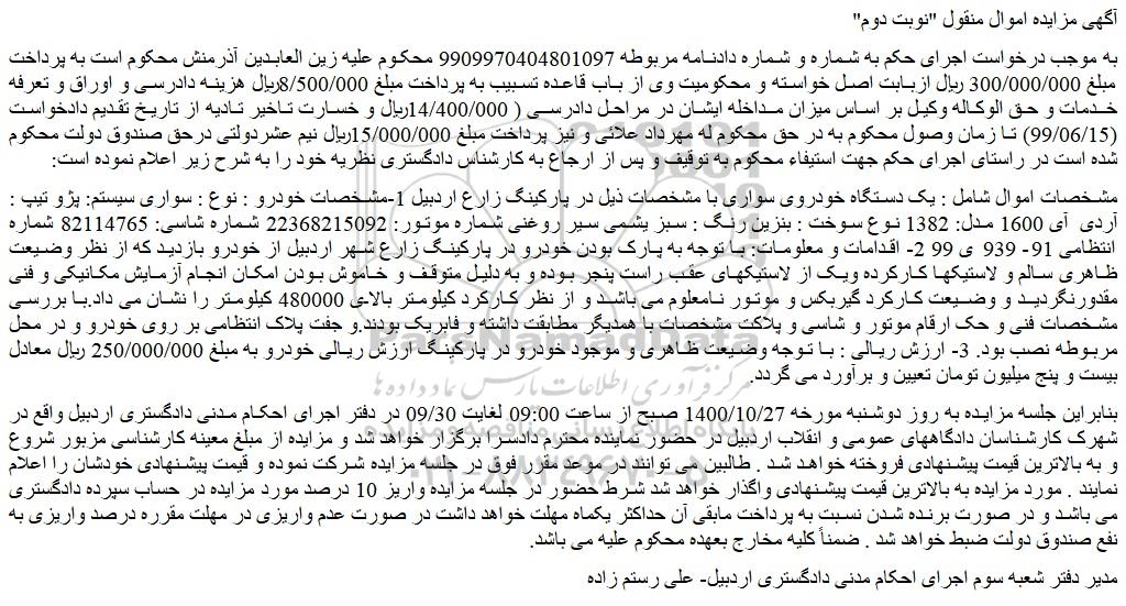 مشخصات اموال شامل : یک دستگاه خودروی سواری با مشخصات ذیل در پارکینگ زارع اردبیل 1-مشخصات خودرو : نوع : سواری سیستم: پژو تیپ : آردی آی 1600 مدل: 1382 نوع سوخت : بنزین رنگ : سبز یشمی سیر روغنی شماره موتور: 22368215092 شماره شاسی: 82114765 شماره انتظامی 91- 939 ی 99 2- اقدامات و معلومات: با توجه به پارک بودن خودرو در پارکینگ زارع شهر اردبیل از خودرو بازدید که از نظر وضیعت ظاهری سالم و لاستیکها کارکرده ویک از لاستیکهای عقب راست پنجر بوده و به دلیل متوقف و خاموش بودن امکان انجام آزمایش مکانیکی و فنی مقدورنگردید و وضیعت کارکرد گیربکس و موتور نامعلوم می باشد و از نظر کارکرد کیلومتر بالای 480000 کیلومتر را نشان می داد.با بررسی مشخصات فنی و حک ارقام موتور و شاسی و پلاکت مشخصات با همدیگر مطابقت داشته و فابریک بودند.و جفت پلاک انتظامی بر روی خودرو و در محل مربوطه نصب بود. 3- ارزش ریالی : با توجه وضیعت ظاهری و موجود خودرو در پارکینگ ارزش ریالی خودرو به مبلغ 250/000/000 ریال معادل بیست و پنج میلیون تومان تعیین و برآورد می گردد.