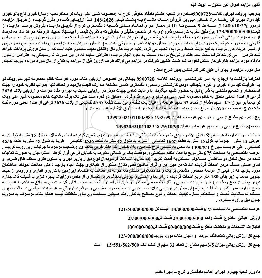 بموجب پرونده اجرایی کلاسه9900728صادره از شعبه هشتم دادگاه حقوقی کرج له :معصومه شیر علی ویک لو محکومعلیه : سارا خیری تاج بانو خیری محمد مراد خیری محمد رضا مراد خانی مبنی بر فروش ملک مشاع به پلاک ثبتی 146/2626 لذا ارزیابی شده و مقرر گردیده از طریق مزایده درمورخ1400/10/27 از ساعت 9 صبح تا 10 در محل اجرای احکام مدنی شعبه دادگستری کرج از طریق مزایده بفروش برسد. مزایده از قیمت123/900/000/000 ریال طبق نظریه کارشناس شروع و به هر شخص حقیقی و حقوقی که بالاترین قیمت را پیشنهاد نمایید فروخته خواهد شد. ده درصد از وجه مزایده را فی المجلس بصورت وجه نقد یا چک بانکی تضمینی از خریدار اخذ و الباقی وجه مزایده ظرف یک ماه از وی وصول و پس از انجام مراحل قانونی و صدور حکم تملیک مورد مزایده به نام خریدار منتقل خواهد شد. در صورتی که در مهلت مقرر خریدار وجه مزایده را پرداخت ننماید سپرده وی پس از کسر هزینه های مزایده به نفع دولت ضبط و مزایده تجدید می گردد. کلیه هزینه های نقل وانتقال بعهده محکوم علیه است که از محل فروش پرداخت خواهد شد طرفین می توانند ظرف مدت یک هفته از تاریخ مزایده نسبت به نحوه انجام مزایده اعتراض نمایند که در این صورت تا رسیدگی به اعتراض از سوی دادگاه مورد مزایده بنام خریدار منتقل نخواهد شد ضمنا طالبین شرکت در مزایده می توانند ظرف 5 روز قبل از مزایده بااطلاع از مال مورد مزایده بازدید نمایند.