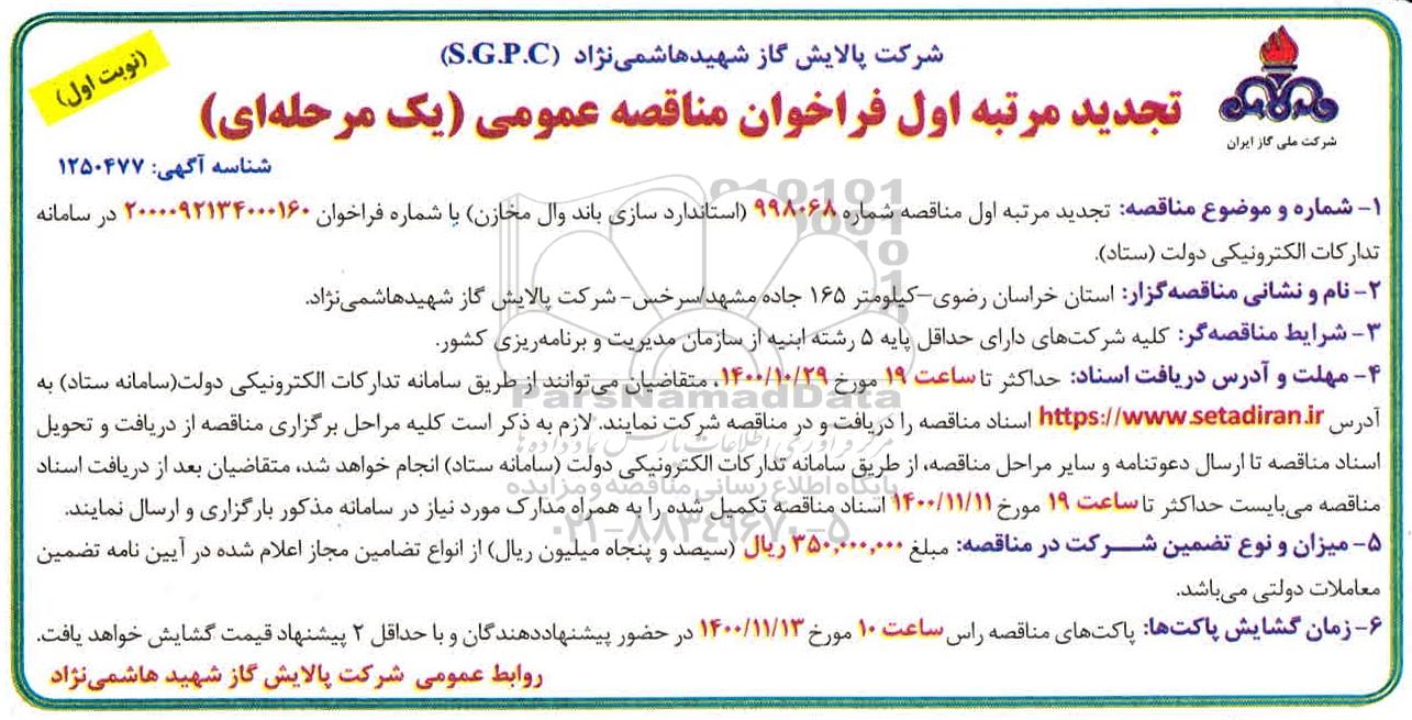 1- شماره و موضوع مناقصه: مناقصه شماره 998068 (استانداردسازی باند وال مخازن) با شماره فراخوان 2000092134000160 در سامانه تدارکات الکترونیکی دولت ستاد