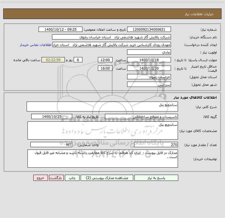 نام دستگاه خریدار:شرکت پالایش گاز شهید هاشمی نژاد استان خراسان رضوی