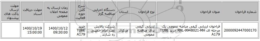 مناقصه، فراخوان ارزیابی کیفی مناصه عمومی یک مرحله ای RNL-9948021-MH خرید TUBE A179 از کلیه افراد متخصص و شرکتها واجد شرایط دعوت به عمل میآید در مناقصه با کد خبرگزاری پارس نماد: 4116678 شرکت نمایند.