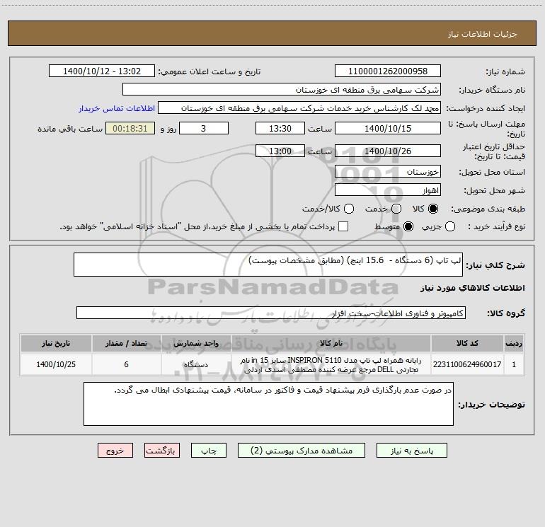 شرح کلی نیاز: لپ تاپ (6 دستگاه - 15.6 اینچ) (مطابق مشخصات پیوست)