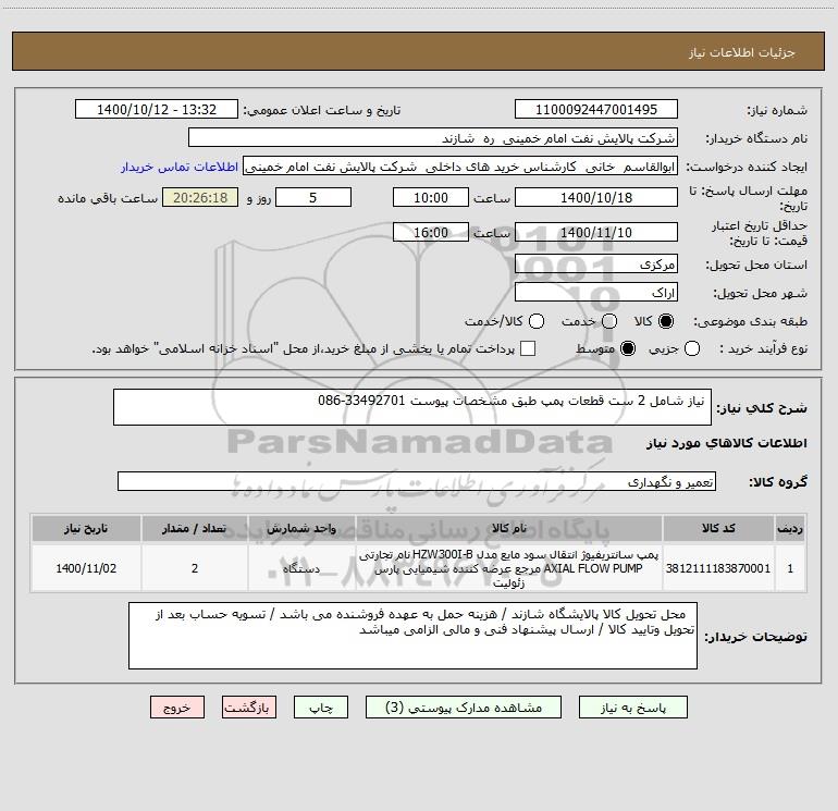 شرح کلی نیاز: نیاز شامل 2 ست قطعات پمپ طبق مشخصات پیوست 33492701-086