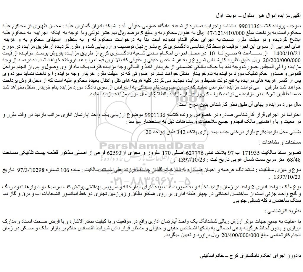 بموجب پرونده کلاسه9901136 دادنامه واجراییه صادره از شعبه دادگاه عمومی حقوقی له : شبکه بادران گستران علیه : محسن ظهیری فر محکوم علیه محکوم است به پرداخت مبلغ 47/121/410/000 ریال به عنوان محکوم به و مبلغ 5 درصد ریال نیم عشر دولتی وبا توجه به اینکه اجراییه به محکوم علیه ابلاغ گردیده و در مهلت مقرر نسبت به اجرای حکم اقدام ننموده است بنا به درخواست محکوم له و به منظور استیفای محکوم به و هزینه های اجرایی از سوی این اجرا توقیف توسط کارشناسی دادگستری کرج بشرح ذیل توصیف و ارزیابی شده و مقرر گردیده از طریق مزایده در مورخ 1400/10/21 از ساعت 9 صبح تا 10 در محل اجرای احکام مدنی شعبه دادگستری کرج از طریق مزایده بفروش برسد. مزایده از قیمت 20/200/000/000 ریال طبق نظریه کارشناس شروع و به هر شخص حقیقی و حقوقی که بالاترین قیمت را بدهد فروخته خواهد شد. ده درصد از وجه مزایده را فی المجلس بصورت وجه نقد یا چک بانکی تضمینی از خریدار اخذ و الباقی وجه مزایده ظرف یک ماه از وی وصول و پس از انجام مراحل قانونی و صدور حکم تملیک مورد مزایده به نام خریدار منتقل خواهد شد. در صورتی که در مهلت مقرر خریدار وجه مزایده را پرداخت ننماید سپرده وی پس از کسر هزینه های مزایده به نفع دولت ضبط و مزایده تجدید می گردد. کلیه هزینه های نقل وانتقال بعهده محکوم علیه است که از محل فروش پرداخت خواهد شد طرفین می توانند مزایده اعتراض نمایند که در این صورت تا رسیدگی به اعتراض از سوی دادگاه مورد مزایده بنام خریدار منتقل نخواهد شد ضمنا طالبین شرکت در مزایده می توانند ظرف 5 روز قبل از مزایده بااطلاع از مال مورد مزایده بازدید نمایند.