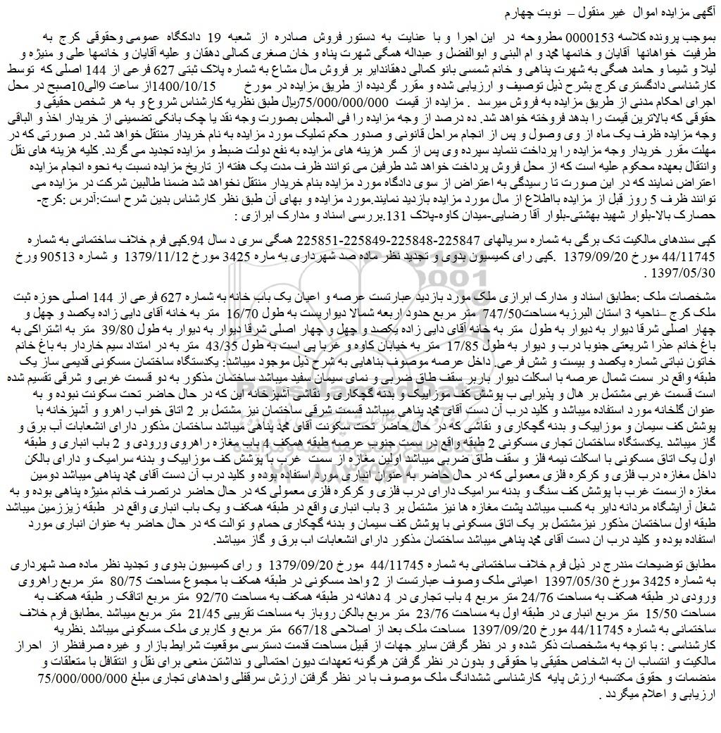 بموجب پرونده کلاسه 0000153 مطروحه در این اجرا و با عنایت به دستور فروش صادره از شعبه 19 دادکگاه عمومی وحقوقی کرج به طرفیت خواهانها آقایان و خانمها محمد و ام البنی و ابوالفضل و عبداله همگی شهرت پناه و خان صغری کمالی دهقان و علیه آقایان و خانمها علی و منیژه و لیلا و شیما و حامد همگی به شهرت پناهی و خانم شمسی بانو کمالی دهقاندایر بر فروش مال مشاع به شماره پلاک ثبتی 627 فرعی از 144 اصلی که توسط کارشناسی دادگستری کرج بشرح ذیل توصیف و ارزیابی شده و مقرر گردیده از طریق مزایده در مورخ 1400/10/15از ساعت 9الی10صبح در محل اجرای احکام مدنی از طریق مزایده به فروش میرسد . مزایده از قیمت 75/000/000/000ریال طبق نظریه کارشناس شروع و به هر شخص حقیقی و حقوقی که بالاترین قیمت را بدهد فروخته خواهد شد. ده درصد از وجه مزایده را فی المجلس بصورت وجه نقد یا چک بانکی تضمینی از خریدار اخذ و الباقی وجه مزایده ظرف یک ماه از وی وصول و پس از انجام مراحل قانونی و صدور حکم تملیک مورد مزایده به نام خریدار منتقل خواهد شد. در صورتی که در مهلت مقرر خریدار وجه مزایده را پرداخت ننماید سپرده وی پس از کسر هزینه های مزایده به نفع دولت ضبط و مزایده تجدید می گردد. کلیه هزینه های نقل وانتقال بعهده محکوم علیه است که از محل فروش پرداخت خواهد شد طرفین می توانند ظرف مدت یک هفته از تاریخ مزایده نسبت به نحوه انجام مزایده اعتراض نمایند که در این صورت تا رسیدگی به اعتراض از سوی دادگاه مورد مزایده بنام خریدار منتقل نخواهد شد ضمنا طالبین شرکت در مزایده می توانند ظرف 5 روز قبل از مزایده بااطلاع از مال مورد مزایده بازدید نمایند.مورد مزایده و بهای آن طبق نظر کارشناس بدین شرح است:آدرس :کرج- حصارک بالا-بلوار شهید بهشتی-بلوار آقا رضایی-میدان کاوه-پلاک 131.بررسی اسناد و مدارک ابرازی :