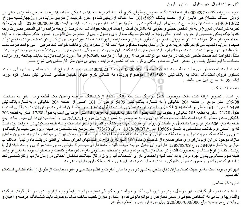 احتراما به استحضار می ساند عطف به ابلاغیه شماره 0000897 مورخه 1400/8/23 در مورد ارجاع امر کارشناسی و ارزیابی بابت دستور فروش ششدانگ ملک به پلاک ثبتی 161/5499 موضوع پرونده به نشانی کرج انتهای خیابان طالقانی شمالی نبش میدان کوه نورد لاک 39 به شرح ذیل می باشد :