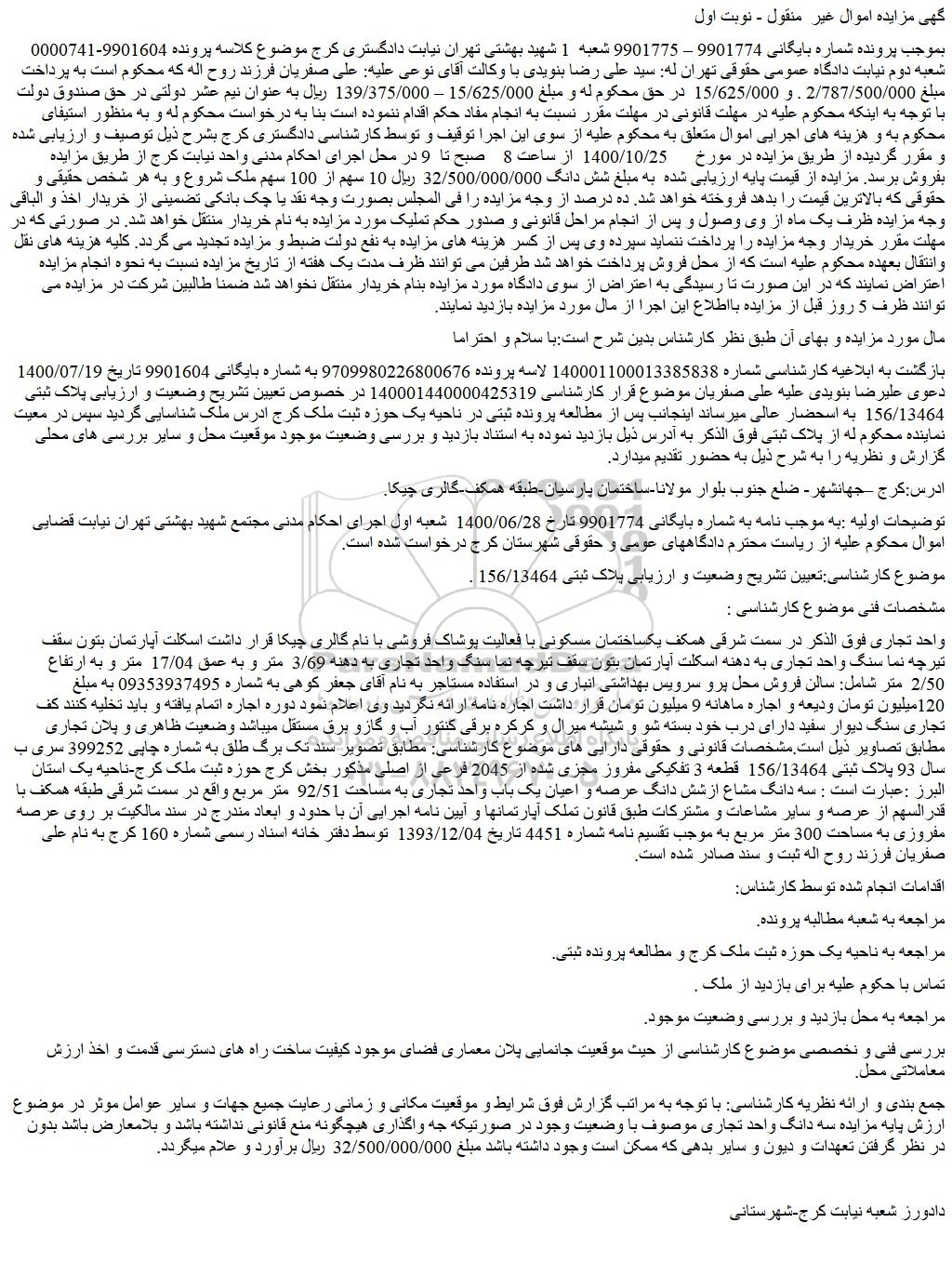 بموجب پرونده شماره بایگانی 9901774 – 9901775 شعبه  1 شهید بهشتی تهران نیابت دادگستری کرج موضوع کلاسه پرونده 9901604-0000741  شعبه دوم نیابت دادگاه عمومی حقوقی تهران له: سید علی رضا بنویدی با وکالت آقای نوعی علیه: علی صفریان فرزند روح اله که محکوم است به پرداخت مبلغ 2/787/500/000 . و 15/625/000  در حق محکوم له و مبلغ 15/625/000 – 139/375/000  ریال به عنوان نیم عشر دولتی در حق صندوق دولت با توجه به اینکه محکوم علیه در مهلت قانونی در مهلت مقرر نسبت به انجام مفاد حکم اقدام ننموده است بنا به درخواست محکوم له و به منظور استیفای محکوم به و هزینه های اجرایی اموال متعلق به محکوم علیه از سوی این اجرا توقیف و توسط کارشناسی دادگستری کرج بشرح ذیل توصیف و ارزیابی شده و مقرر گردیده از طریق مزایده در مورخ      1400/10/25  از ساعت 8    صبح تا  9 در محل اجرای احکام مدنی واحد نیابت کرج از طریق مزایده بفروش برسد. مزایده از قیمت پایه ارزیابی شده  به مبلغ شش دانگ 32/500/000/000  ریال 10 سهم از 100 سهم ملک شروع و به هر شخص حقیقی و حقوقی که بالاترین قیمت را بدهد فروخته خواهد شد. ده درصد از وجه مزایده را فی المجلس بصورت وجه نقد یا چک بانکی تضمینی از خریدار اخذ و الباقی وجه مزایده ظرف یک ماه از وی وصول و پس از انجام مراحل قانونی و صدور حکم تملیک مورد مزایده به نام خریدار منتقل خواهد شد. در صورتی که در مهلت مقرر خریدار وجه مزایده را پرداخت ننماید سپرده وی پس از کسر هزینه های مزایده به نفع دولت ضبط و مزایده تجدید می گردد. کلیه هزینه های نقل وانتقال بعهده محکوم علیه است که از محل فروش پرداخت خواهد شد طرفین می توانند ظرف مدت یک هفته از تاریخ مزایده نسبت به نحوه انجام مزایده اعتراض نمایند که در این صورت تا رسیدگی به اعتراض از سوی دادگاه مورد مزایده بنام خریدار منتقل نخواهد شد ضمنا طالبین شرکت در مزایده می توانند ظرف 5 روز قبل از مزایده بااطلاع این اجرا از مال مورد مزایده بازدید نمایند.