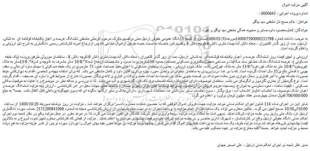 ،به موجب دادنامه شماره 140007390000215798مورخه1400/01/31صادره از شعبه 5 دادگاه عمومی حقوقی اردبیل مبنی برتقسیم ماترک مرحوم غربعلی مشفقی ششدانگ عرصه و اعیان یکبابخانه قولنامه ای به نشانی :اردبیل، بعد از زیر گذر کلخوران ، محله دانش آباد،بیست متری دانش 9،کوچه دانش 8 وتقسیم ثمن حاصله به نسبت حصه طرفین ازاموال مشاعی که پس ازارجاع امربه کارشناس رسمی دادگستری به شرح ذیل ارزیابی و واعلام گردیده است.