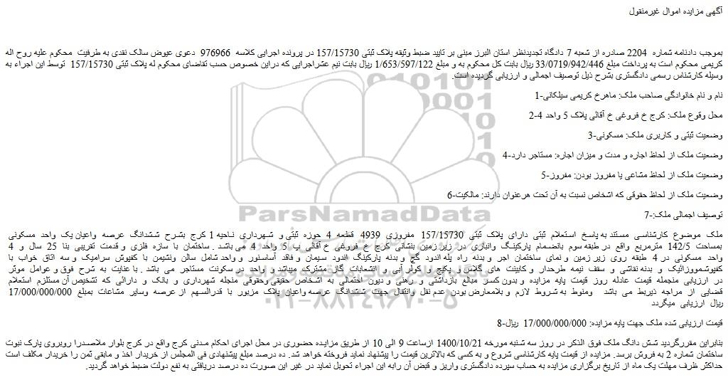 بموجب دادنامه شماره 2204 صادره از شعبه 7 دادگاه تجدیدنظر استان البرز مبنی بر تایید ضبط وثیقه پلاک ثبتی 157/15730 در پرونده اجرایی کلاسه 976966 دعوی عیوض سالک نقدی به طرفیت محکوم علیه روح اله کریمی محکوم است به پرداخت مبلغ 33/0719/942/446 ریال بابت کل محکوم به و مبلغ 1/653/597/122 ریال بابت نیم عشراجرایی که دراین خصوص حسب تقاضای محکوم له پلاک ثبتی 157/15730 توسط این اجراء به وسیله کارشناس رسمی دادگستری بشرح ذیل توصیف اجمالی و ارزیابی گردیده است.