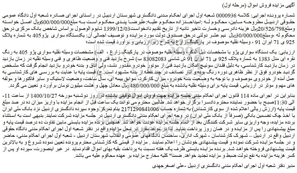 شماره پرونده اجرایی: کلاسه 0000936 شعبه اول اجرای احکام مدنی دادگستری شهرستان اردبیل در راستای اجرای صادره شعبه اول دادگاه عمومی حقوقی اردبیل مطروحه مابین، محکوم له :امیداحدزاده محکوم علیه:علیرضا پندی محکوم است به مبلغ600/000/000ریال اصل خواسته ومبلغ20/526/798ریال هزینه دادرسی وخسارت تاخیر تادیه از تاریخ تقدیم دادخواست1399/12/03 تایوم الوصول براساس شاخص بانک مرکزی درحق محکوم له ،ومبلغ30/000/000ریال نیم عشر دولتی درحق صندوق دولت مورد مزایده و توصیف اجمالی آن: یکدستگاه سواری پژو405 به شماره پلاک 925 ی 71 ایران 91 ، وسیله نقلیه موصوف در پارکینگ زارع به شرح زیر ارزیابی و برآورد قیمت شده است؛