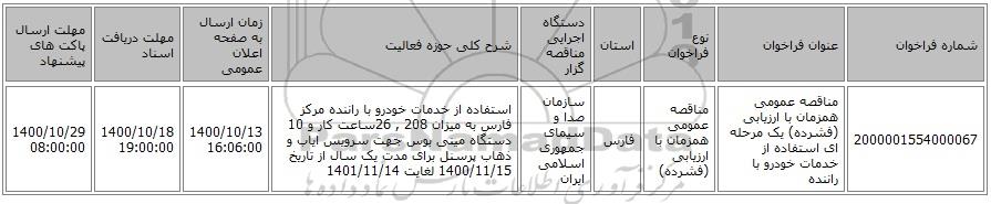 | 2000001554000067 | مناقصه عمومی همزمان با ارزیابی (فشرده) یک مرحله ای استفاده از خدمات خودرو با راننده | مناقصه عمومی همزمان با ارزیابی (فشرده) | فارس | سازمان صدا و سیمای جمهوری اسلامی ایران | استفاده از خدمات خودرو با راننده مرکز فارس به میزان 208 , 26ساعت کار و 10 دستگاه مینی بوس جهت سرویس ایاب و ذهاب پرسنل برای مدت یک سال از تاریخ 1400/11/15 لغایت 1401/11/14 | 1400/10/13 16:06:00 | 1400/10/18 19:00:00 | 1400/10/29 08:00:00 |
