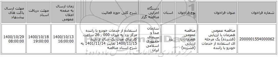 | 2000001554000062 | مناقصه عمومی همزمان با ارزیابی (فشرده) یک مرحله ای استفاده از خدمات خودرو با راننده | مناقصه عمومی همزمان با ارزیابی (فشرده) | یزد | سازمان صدا و سیمای جمهوری اسلامی ایران | استفاده از خدمات خودرو با راننده مرکز یزد به میزان 000 , 26 ساعت کار برای مدت یک سال از تاریخ 1400/11/15 لغایت 1401/11/14 به شرح اسناد مناقصه | 1400/10/13 16:00:00 | 1400/10/18 19:00:00 | 1400/10/29 08:00:00 |