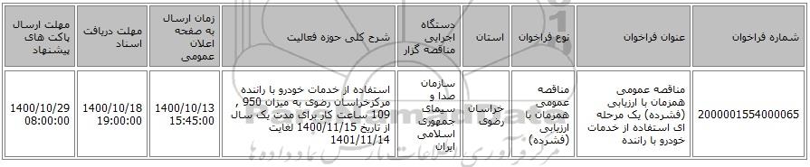 | 2000001554000065 | مناقصه عمومی همزمان با ارزیابی (فشرده) یک مرحله ای استفاده از خدمات خودرو با راننده | مناقصه عمومی همزمان با ارزیابی (فشرده) | خراسان رضوی | سازمان صدا و سیمای جمهوری اسلامی ایران | استفاده از خدمات خودرو با راننده مرکزخراسان رضوی به میزان 950 , 109 ساعت کار برای مدت یک سال از تاریخ 1400/11/15 لغایت 1401/11/14 | 1400/10/13 15:45:00 | 1400/10/18 19:00:00 | 1400/10/29 08:00:00 |