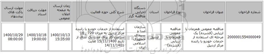 | 2000001554000049 | مناقصه عمومی همزمان با ارزیابی (فشرده) یک مرحله ای استفاده از خدمات خودرو با راننده مرکز اردبیل | مناقصه عمومی همزمان با ارزیابی (فشرده) | اردبیل | سازمان صدا و سیمای جمهوری اسلامی ایران | استفاده از خدمات خودرو با راننده مرکز اردبیل به میزان 720 , 18 ساعت کار برای مدت یک سال از تاریخ 15/11/1400 لغایت 14/11/1401 | 1400/10/13 15:35:00 | 1400/10/18 19:00:00 | 1400/10/29 08:00:00 |