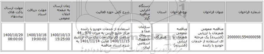 | 2000001554000058 | مناقصه عمومی همزمان با ارزیابی (فشرده) یک مرحله ای استفاده از خدمات خودرو با راننده | مناقصه عمومی همزمان با ارزیابی (فشرده) | هرمزگان | سازمان صدا و سیمای جمهوری اسلامی ایران | استفاده از خدمات خودرو با راننده مرکز خلیج فارس به میزان 970 , 44 ساعت کار برای مدت یک سال از تاریخ 1400/11/15 لغایت 1401/11/14 به شرح اسناد مناقصه | 1400/10/13 15:25:00 | 1400/10/18 19:00:00 | 1400/10/29 08:00:00 |