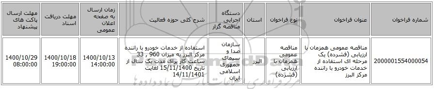 | 2000001554000054 | مناقصه عمومی همزمان با ارزیابی (فشرده) یک مرحله ای استفاده از خدمات خودرو با راننده مرکز البرز | مناقصه عمومی همزمان با ارزیابی (فشرده) | البرز | سازمان صدا و سیمای جمهوری اسلامی ایران | استفاده از خدمات خودرو با راننده مرکز البرز به میزان 960 , 33 ساعت کار برای مدت یک سال از تاریخ 15/11/1400 لغایت 14/11/1401 | 1400/10/13 14:00:00 | 1400/10/18 19:00:00 | 1400/10/29 08:00:00 |