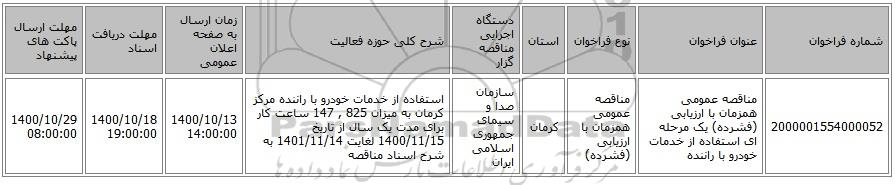 | 2000001554000052 | مناقصه عمومی همزمان با ارزیابی (فشرده) یک مرحله ای استفاده از خدمات خودرو با راننده | مناقصه عمومی همزمان با ارزیابی (فشرده) | کرمان | سازمان صدا و سیمای جمهوری اسلامی ایران | استفاده از خدمات خودرو با راننده مرکز کرمان به میزان 825 , 147 ساعت کار برای مدت یک سال از تاریخ 1400/11/15 لغایت 1401/11/14 به شرح اسناد مناقصه | 1400/10/13 14:00:00 | 1400/10/18 19:00:00 | 1400/10/29 08:00:00 |