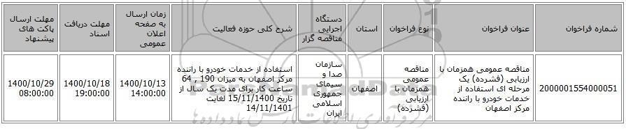 | 2000001554000051 | مناقصه عمومی همزمان با ارزیابی (فشرده) یک مرحله ای استفاده از خدمات خودرو با راننده مرکز اصفهان | مناقصه عمومی همزمان با ارزیابی (فشرده) | اصفهان | سازمان صدا و سیمای جمهوری اسلامی ایران | استفاده از خدمات خودرو با راننده مرکز اصفهان به میزان 190 , 64 ساعت کار برای مدت یک سال از تاریخ 15/11/1400 لغایت 14/11/1401 | 1400/10/13 14:00:00 | 1400/10/18 19:00:00 | 1400/10/29 08:00:00 |