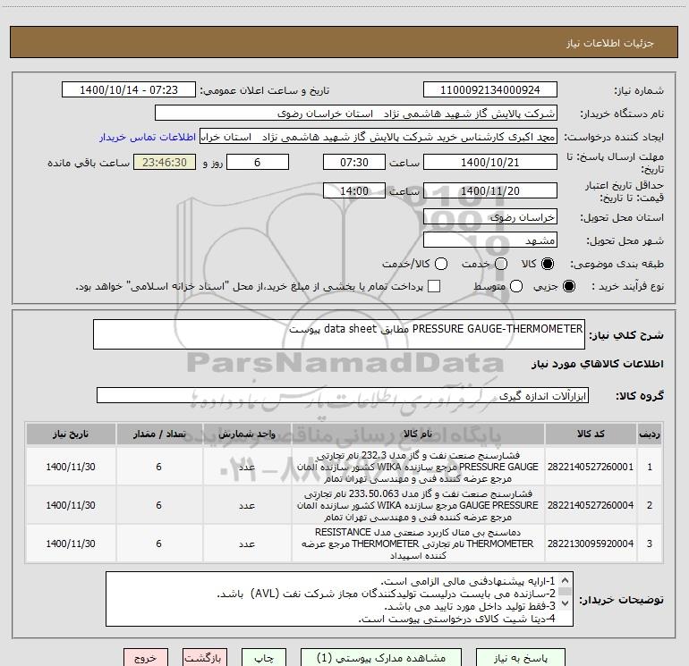 شرح کلی نیاز: PRESSURE GAUGE-THERMOMETER مطابق data sheet پیوست