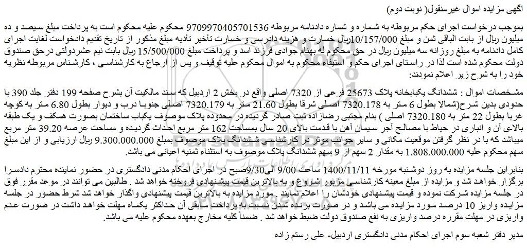 مشخصات اموال : ششدانگ یکبابخانه پلاک 25673 فرعی از 7320 اصلی واقع در بخش 2 اردبیل که سند مالکیت آن بشرح صفحه 199 دفتر جلد 390 با حدودی بدین شرح(شمالا بطول 6 متر به 7320.178 اصلی شرقا بطول 21.60 متر به 7320.179 اصلی جنوبا درب و دیوار بطول 6.80 متر به کوچه غربا بطول 22 متر به 7320.180 اصلی ) بنام مجتبی رضازاده ثبت صادر گردیده در محدوده پلاک موصوف یکباب ساختمان بصورت همکف و یک طبقه بالای آن و انباری در حیاط با مصالح آجر سیمان آهن با قدمت بالای 20 سال بمساحت 162 متر مربع احداث گردیده و مساحت عرصه 39.20 متر مربع میباشد که با در نظر گرفتن موقعیت مکانی و سایر جوانب موثر در کارشناسی ششدانگ پلاک موصوف بمبلغ 9.300.000.000 ریال ارزیابی و از این مبلغ سهم محکوم علیه 1.808.000.000 به مقدار 2 سهم از 9 سهم ششدانگ پلاک موصوف به استثناء ثمنیه اعیانی می باشد.