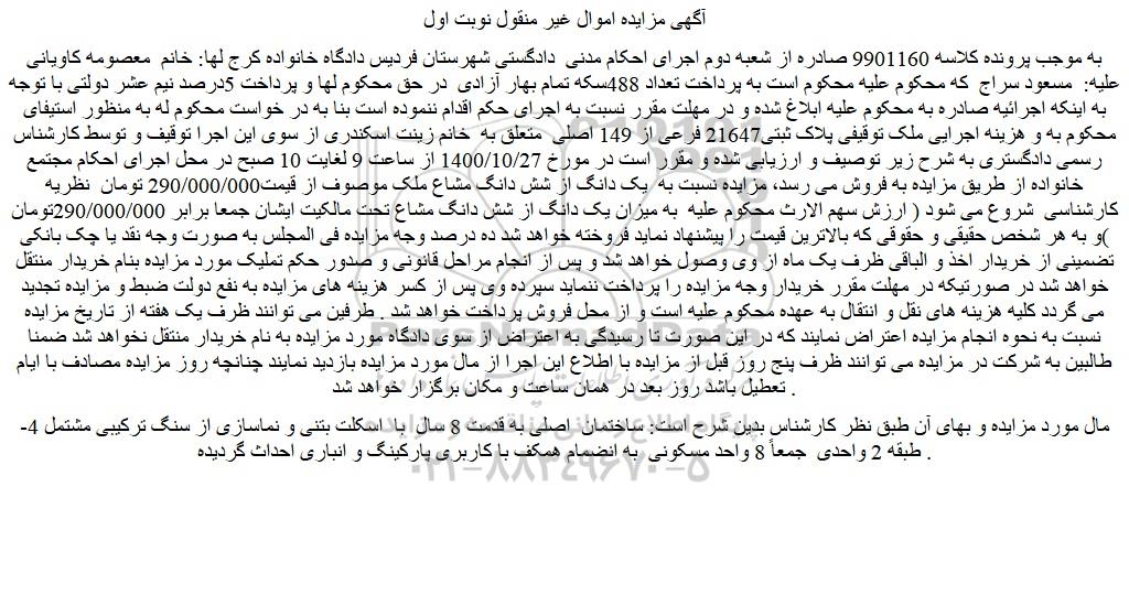 به موجب پرونده کلاسه 9901160 صادره از شعبه دوم اجرای احکام مدنی دادگستی شهرستان فردیس دادگاه خانواده کرج لها: خانم معصومه کاویانی علیه: مسعود سراج که محکوم علیه محکوم است به پرداخت تعداد 488سکه تمام بهار آزادی در حق محکوم لها و پرداخت 5درصد نیم عشر دولتی با توجه به اینکه اجرائیه صادره به محکوم علیه ابلاغ شده و در مهلت مقرر نسبت به اجرای حکم اقدام ننموده است بنا به در خواست محکوم له به منظور استیفای محکوم به و هزینه اجرایی ملک توقیفی پلاک ثبتی21647 فرعی از 149 اصلی متعلق به خانم زینت اسکندری از سوی این اجرا توقیف و توسط کارشناس رسمی دادگستری به شرح زیر توصیف و ارزیابی شده و مقرر است در مورخ 1400/10/27 از ساعت 9 لغایت 10 صبح در محل اجرای احکام مجتمع خانواده از طریق مزایده به فروش می رسد، مزایده نسبت به یک دانگ از شش دانگ مشاع ملک موصوف از قیمت290/000/000 تومان نظریه کارشناسی شروع می شود ( ارزش سهم الارث محکوم علیه به میزان یک دانگ از شش دانگ مشاع تحت مالکیت ایشان جمعا برابر 290/000/000تومان )و به هر شخص حقیقی و حقوقی که بالاترین قیمت را پیشنهاد نماید فروخته خواهد شد ده درصد وجه مزایده فی المجلس به صورت وجه نقد یا چک بانکی تضمینی از خریدار اخذ و الباقی ظرف یک ماه از وی وصول خواهد شد و پس از انجام مراحل قانونی و صدور حکم تملیک مورد مزایده بنام خریدار منتقل خواهد شد در صورتیکه در مهلت مقرر خریدار وجه مزایده را پرداخت ننماید سپرده وی پس از کسر هزینه های مزایده به نفع دولت ضبط و مزایده تجدید می گردد کلیه هزینه های نقل و انتقال به عهده محکوم علیه است و از محل فروش پرداخت خواهد شد . طرفین می توانند ظرف یک هفته از تاریخ مزایده نسبت به نحوه انجام مزایده اعتراض نمایند که در این صورت تا رسیدگی به اعتراض از سوی دادگاه مورد مزایده به نام خریدار منتقل نخواهد شد ضمنا طالبین به شرکت در مزایده می توانند ظرف پنج روز قبل از مزایده با اطلاع این اجرا از مال مورد مزایده بازدید نمایند چنانچه روز مزایده مصادف با ایام تعطیل باشد روز بعد در همان ساعت و مکان برگزار خواهد شد .