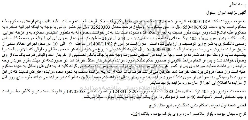 به موجب پرونده کلاسه 0000118صادره از شعبه 27 دادگاه عمومی حقوقی کرج له: بانک قرض الحسنه رسالت علیه: آقای بهنام فرهادی محکوم علیه محکوم است به پرداخت 650/406/063 ریال در حق محکوم له ومبلغ5 درصد معادل 32520303 ریال نیم عشر دولتی با توجه به اینکه اجرائیه صادره به محکوم علیه ابلاغ شده ودر مهلت مقرر نسبت به اجرای حکم اقدام ننموده است بنا به در خواست محکوم له به منظور استیفای محکوم به و هزینه اجرایی یکدستگاه خودرو سواری پژو 405 نوک مدادی به شماره انتظامی77 ص 344 ایران 21 متعلق به نامبرده از سوی این اجرا توقیف و توسط کارشناس رسمی دادگستری به شرح زیر توصیف و ارزیابی شده است. مقرر است در مورخ 1400/11/02از ساعت 9 الی 10 در محل اجرای احکام مدنی از طریق مزایده بفروش می رسد، مزایده از قیمت 550/000/000 ریال نظریه کارشناسی شروع می شود و به هر شخص حقیقی وحقوقی که بالاترین قیمت را پیشنهاد نماید فروخته خواهد شد. ده درصد وجه مزایده فی المجلس بصورت وجه نقد یا چک بانکی تضمینی از خریدار اخذ والباقی ظرف یک ماه از وی وصول خواهد شد و پس از انجام مراحل قانونی و صدور حکم تملیک مورد مزایده بنام خریدار منتقل خواهد شد. در صورتیکه در مهلت مقرر خریدار وجه مزایده را پرداخت ننماید سپرده وی پس از کسر هزینه های مزایده به نفع دولت ضبط ومزایده تجدید می گردد کلیه هزینه های نقل وانتقال به عهده محکوم علیه است واز محل فروش پرداخت خواهد شد. طرفین می توانند ظرف یک هفته از تاریخ مزایده نسبت به نحوه انجام مزایده اعتراض نمایند که در این صورت تا رسیدگی به اعتراض از سوی دادگاه مورد مزایده به نام خریدار منتقل نخواهد شد. ضمنا طالبین به شرکت در مزایده می توانند ظرف پنج روز قبل از مزایده با اطلاع این اجرا از مال مورد مزایده بازدید نمایند.