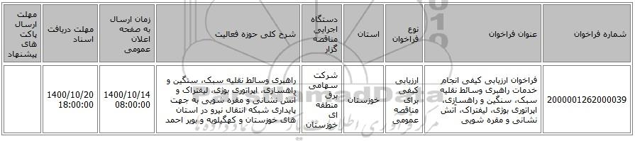 2000001262000039فراخوان ارزیابی کیفی انجام خدمات راهبری وسائط نقلیه سبک، سنگین و راهسازی، اپراتوری بوژی، لیفتراک، آتش نشانی و مقره شوییارزیابی کیفی برای مناقصه عمومیخوزستانشرکت سهامی برق منطقه ای خوزستانراهبری وسائط نقلیه سبک، سنگین و راهسازی، اپراتوری بوژی، لیفتراک و آتش نشانی و مقره شویی به جهت پایداری شبکه انتقال نیرو در استان های خوزستان و کهگیلویه و بویر احمد 1400/10/14 08:00:001400/10/20 18:00:00